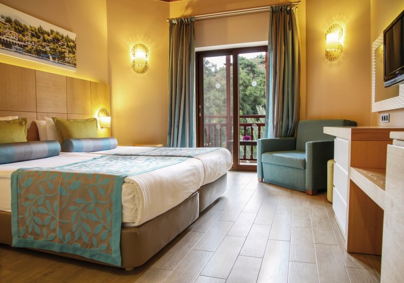 Ihr wohnt in Zimmern mit Klimaanlage, Dusche, LCD-Sat-TV, Safe und Minibar; Wasserkocher beziehungsweise Kaffee-/Teezubereiter stehen bereit. Ein Balkon, französischer Balkon oder eine Terrasse öffnet den Blick – je nach Lage aufs Meer oder in den Garten. Familienzimmer und verschiedene Bettentypen erleichtern die Planung mit Kindern; Zustell- und Kinderbetten sind vorgesehen.