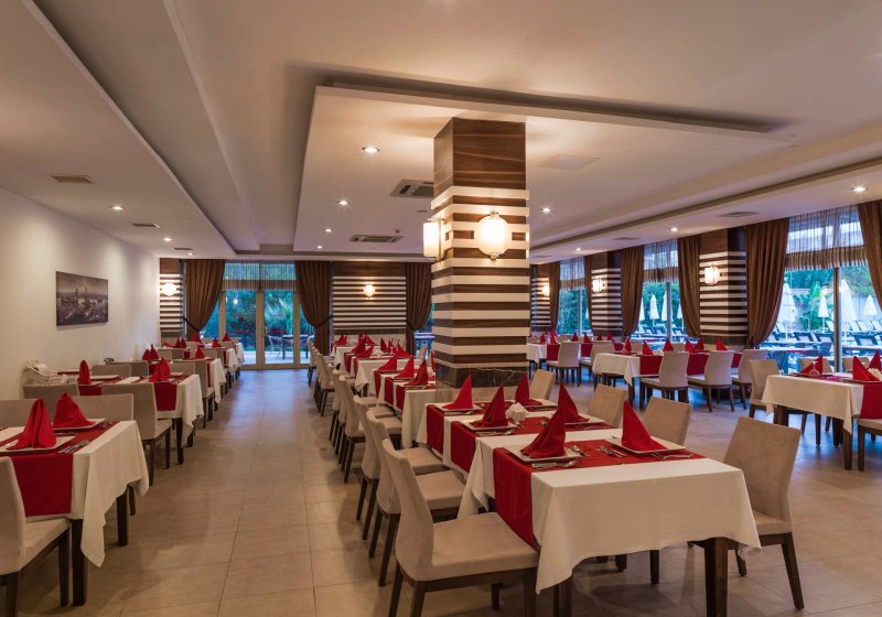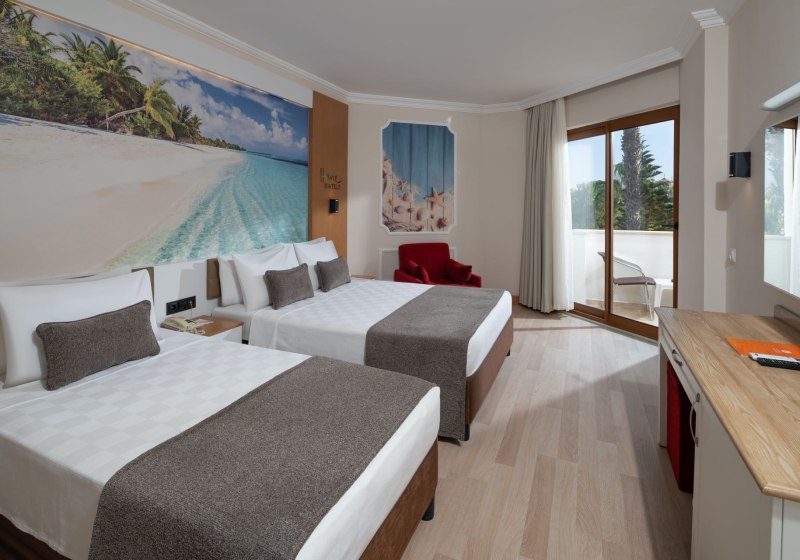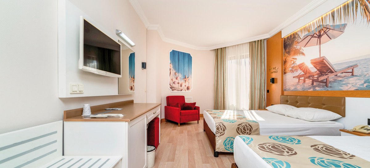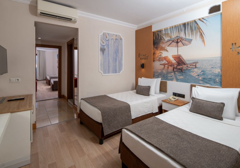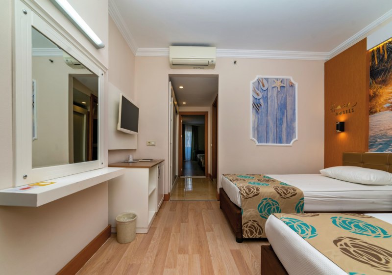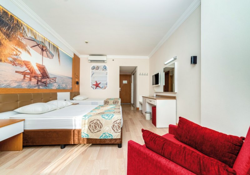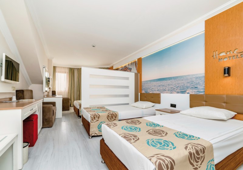 Hane Family Resort verbindet kurze Wege zum breiten Sandstrand mit klar strukturierter Resortlogik aus Pools, Aquapark und abgestimmter Unterhaltung. Kulinarisch erwartet Euch Vielfalt vom Buffet mit Terrasse bis zu À‑la‑carte, flankiert von Bars zwischen Lobby und Strand.