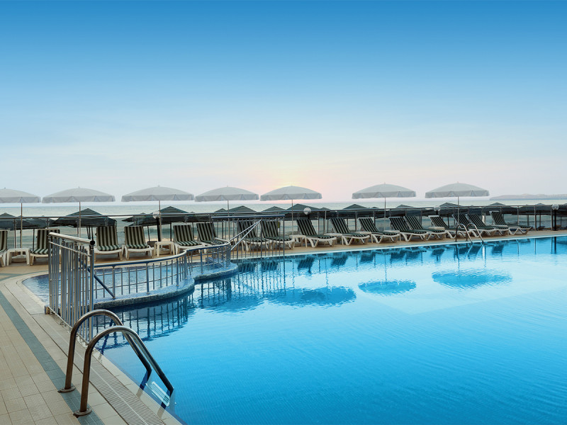 • Liegestühle • Hallenbad • Außenpool • Sonnenschirme • Poolbar • Sonnenterrasse • Badetücher • Pool