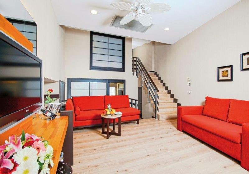 Für Familien stehen Varianten mit Whirlpool im Schlafzimmer, Maisonette-Familienteil und Verbindungslösungen bereit. Ausblicke reichen je nach Lage von Garten über Pool bis zum Meer. Verdunkelungsvorhänge, schallisolierte Einheiten und internationale Sender unterstützen erholsame Nächte im Urlaub.