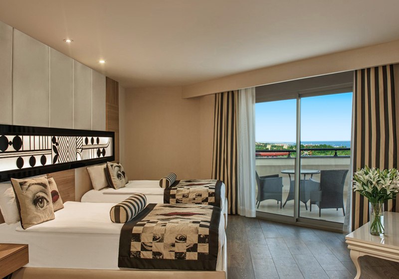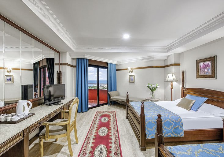 Die Zimmer bieten praxistaugliche Ausstattung mit Dusche, Föhn, zentraler Klimaanlage, LCD‑Sat‑TV mit Musikkanal, Wasserkocher, Direktwahltelefon, Minibar und Safe. Laminat‑ oder Keramikboden und ein Balkon gehören zum Standard. Buchbar sind Varianten mit seitlichem oder direktem Meerblick – für klare Ausrichtungen auf Strand und Wasser.