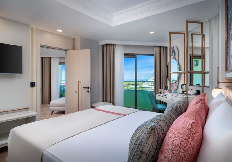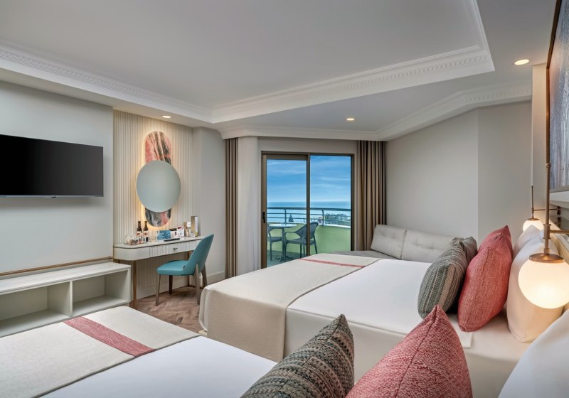 Familien greifen zu Zimmern mit separatem Schlafzimmer und Verbindungstür (seitlicher Meerblick). Für mehr Raumgefühl steht die Juniorsuite mit großem Balkon bereit, zusätzlich mit Kaffeemaschine. So wählt Ihr zwischen cleverem Familiengrundriss und Suite‑Komfort. Highlight: Meerblick‑Optionen mit wählbarer Ausrichtung für Eure Priorität.