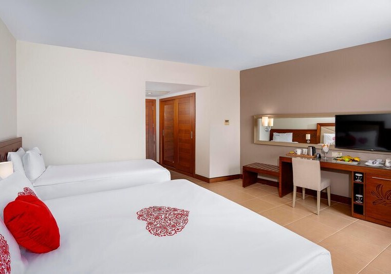 WLAN in der gesamten Anlage ist inklusive, die Lobby mit Rezeption und vier Aufzügen sorgt für reibungslose Wege. Draußen erwartet Euch ein Süßwasserpool, ein separates Kinderbecken und ein Pool mit fünf Wasserrutschen. Highlight: Liegen, Schirme, Auflagen und Badetücher sind an Pool und Strand inklusive.