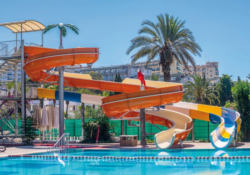 • Liegestühle • Hallenbad • Außenpool • Sonnenschirme • Poolbar • Sonnenterrasse • Badetücher • Wasserrutsche • Pool