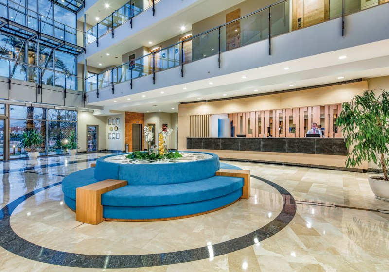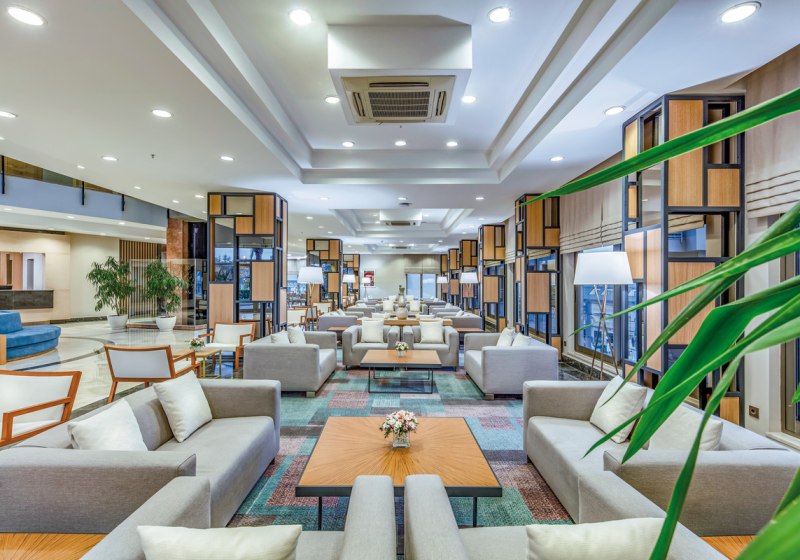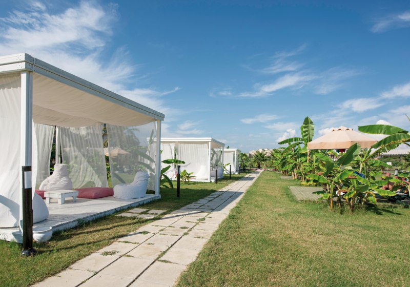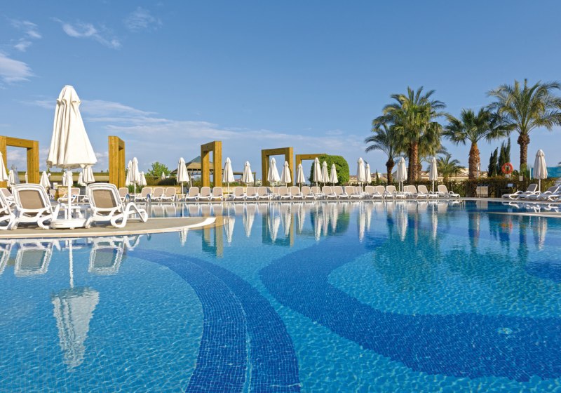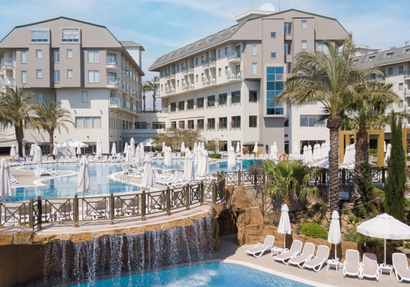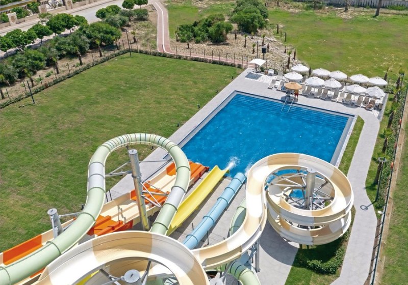 Die Anlage gliedert sich in Lobby, Rezeption und ruhige Sitzbereiche mit WLAN. Geschäfte, Friseur und eine Sat-TV-Lounge ergänzen die Infrastruktur. Draußen dominieren ein großer Außenpool, ein separates Kinderbecken und ein Relaxpool. Herzstück ist der Aquapark mit sieben Wasserrutschen und Mini-Aquatower.
