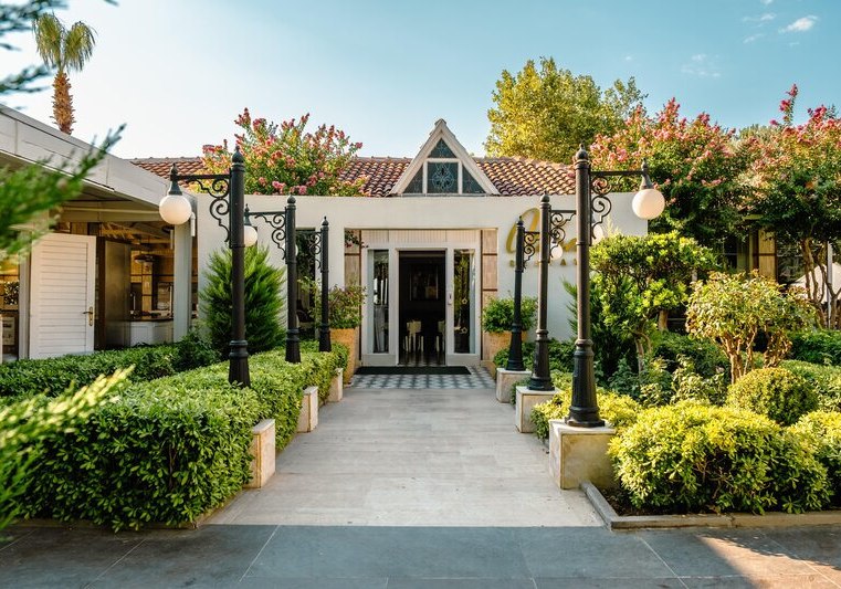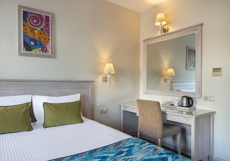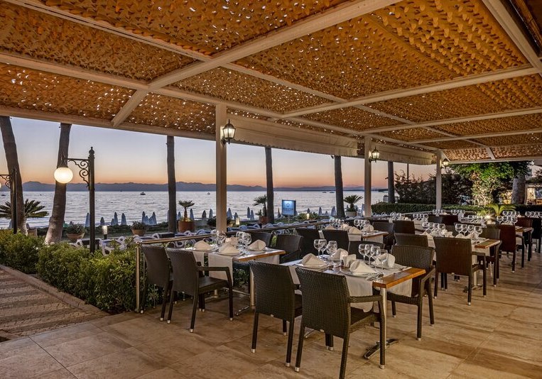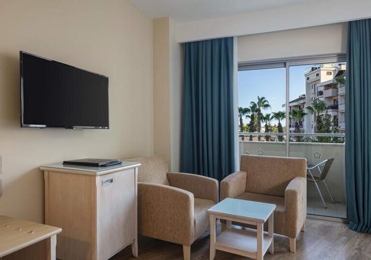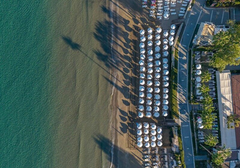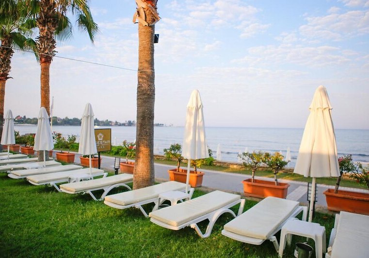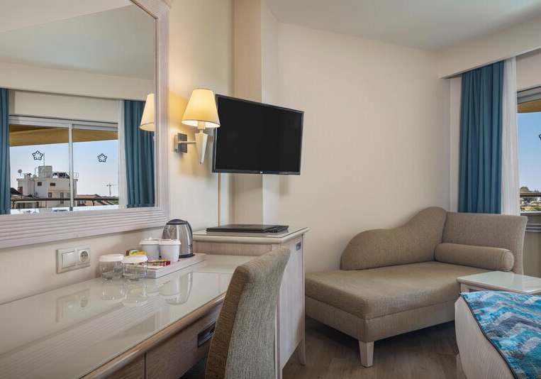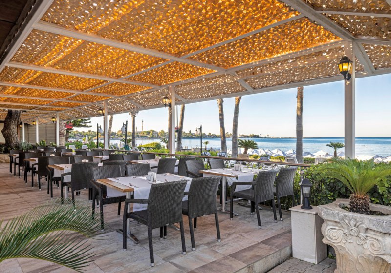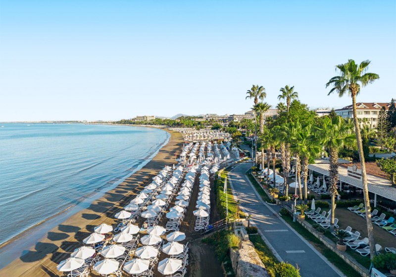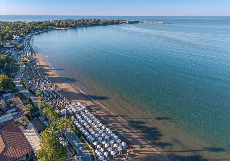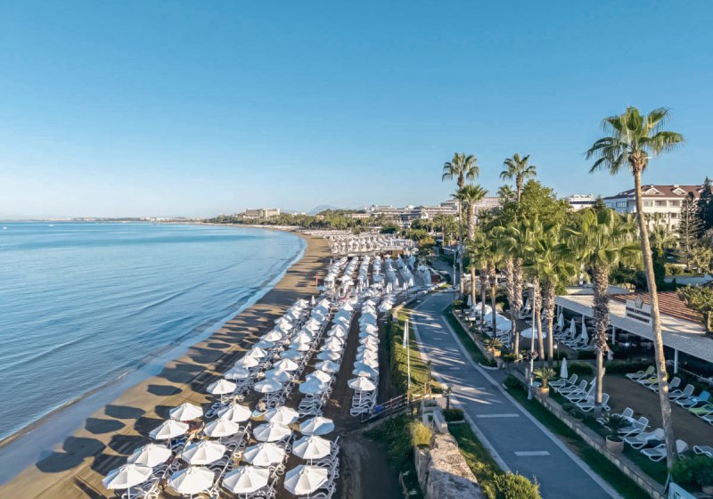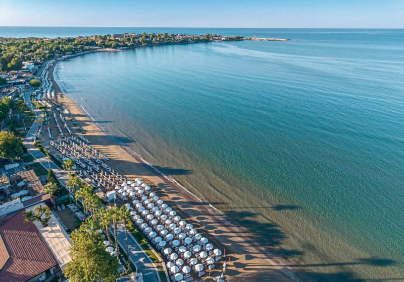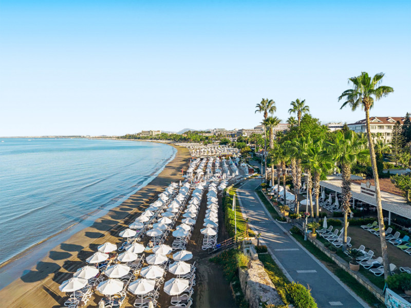 Ihr erreicht den flach abfallenden Sandstrand nach rund 200 Metern – ideal für kurze Wege mit der Beachtasche. Bis ins Ortszentrum von Side sind es etwa 1,5 Kilometer, Minibusse und Taxis verkehren in der Nähe. So kombiniert Ihr Strandnähe mit unkomplizierter Anbindung an Geschäfte, Restaurants und antike Kulissen der Umgebung.