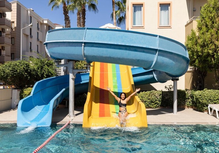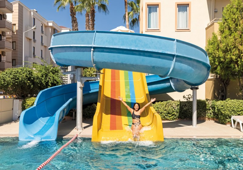 - Rutschenspaß: Zwei Wasserrutschen setzen sportliche, schnelle Akzente am Pool.