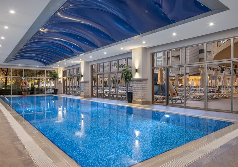 • Liegestühle • Hallenbad • Außenpool • Sonnenschirme • Pool • Poolbar • Badetücher • Wasserrutsche • Sonnenterrasse