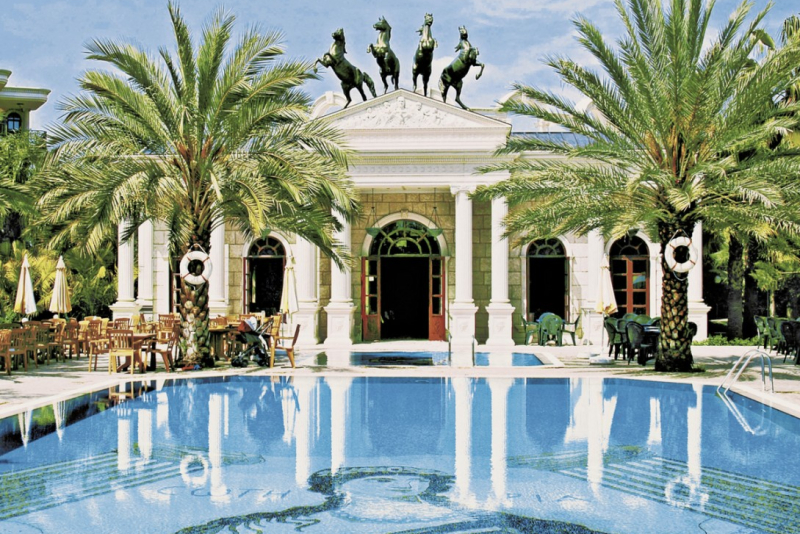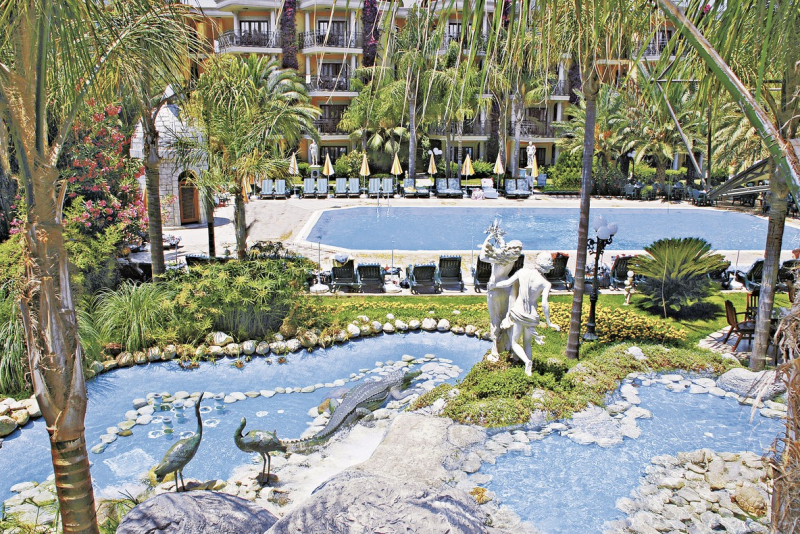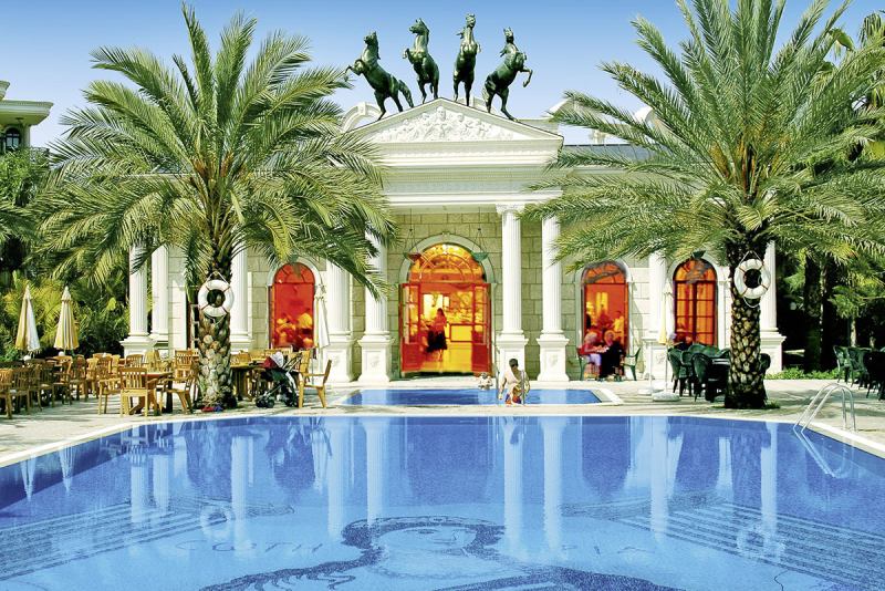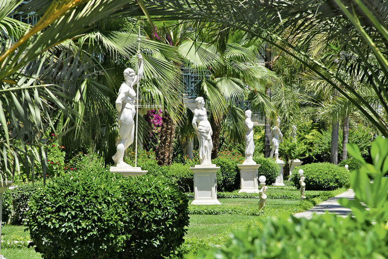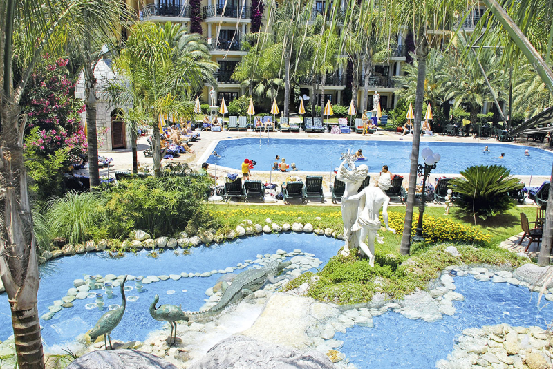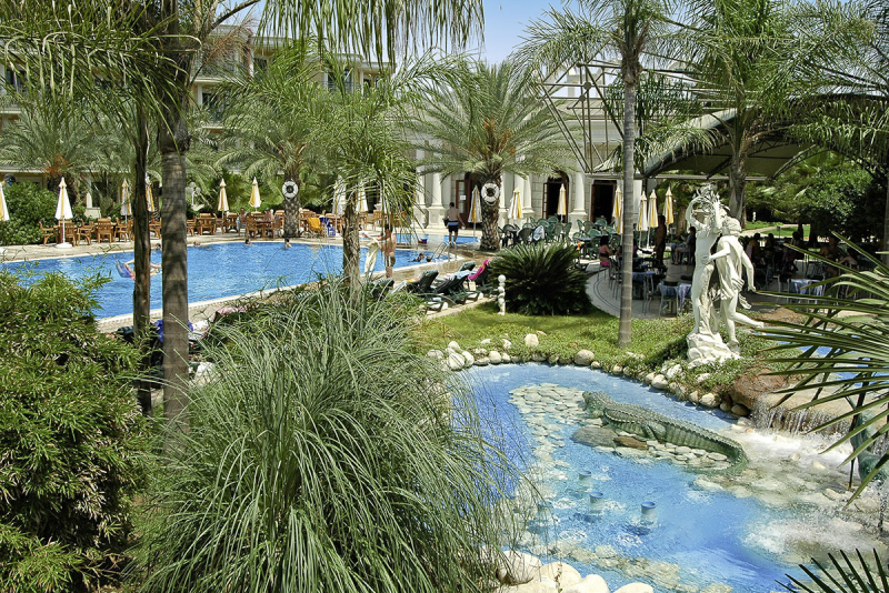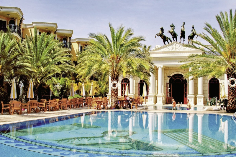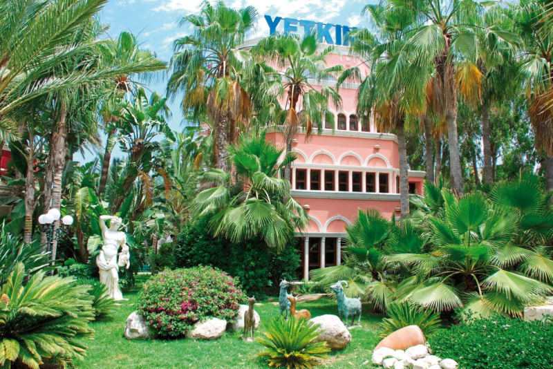 Das Yetkin Club Hotel liegt nur 14 Kilometer von Alanya entfernt an der türkischen Riviera. Die Anlage befindet sich inmitten einer herrlichen Naturlandschaft und fällt mit seiner außergewöhnlichen Architektur im antiken Stil sofort ins Auge. Säulen, Wasserfälle, Statuen und Springbrunnen machen das Hotel zu einem besonderen optischen Erlebnis. Es ist nur 50 Meter vom Strand entfernt, und das Zentrum mit seinen Sehenswürdigkeiten ist mit 500 Metern Distanz ebenfalls gut zu erreichen. Bars, Einkaufsmöglichkeiten und Restaurants sind in der Nähe vorhanden.