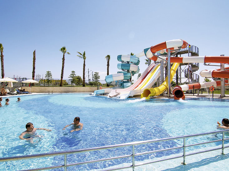 Die Anlage gliedert 407 Zimmer über sieben Etagen mit Lift, zentralem Empfang und Lounge. WLAN ist in der gesamten Anlage und am Strand verfügbar. Im Außenbereich verteilen sich mehrere Süßwasserpools, Kinderbecken und sechs Wasserrutschen rund um die Sonnenterrasse. Liegen, Auflagen, Sonnenschirme und Badetücher stehen am Pool und Strand bereit; der Strand-Shuttle bindet alles zusammen.