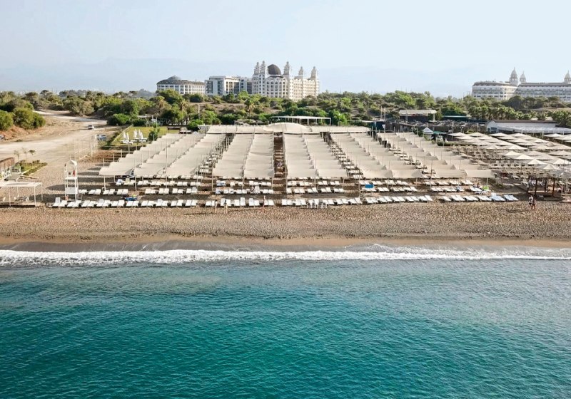 Am Standort Titreyengöl logiert Ihr nah am Meer: Der Strand liegt etwa 300 Meter entfernt und ist per Shuttle bequem erreichbar. In die Stadt Manavgat sind es rund 5 Kilometer, zur Altstadt von Side etwa 7 Kilometer – ideal für Ausflüge zwischen Flusslandschaft, Basaren und antiken Kulissen. Der Flughafen Antalya ist mit circa 65 Kilometern Distanz klar umrissen. Am Strand stehen Liegen und Sonnenschirme bereit, dazu sorgt eine Beachbar für kurze Wege. So kombiniert Ihr Badepausen, kleine Erkundungen und abendliche Spaziergänge mit festen Anhaltspunkten für Planung und Timing.