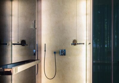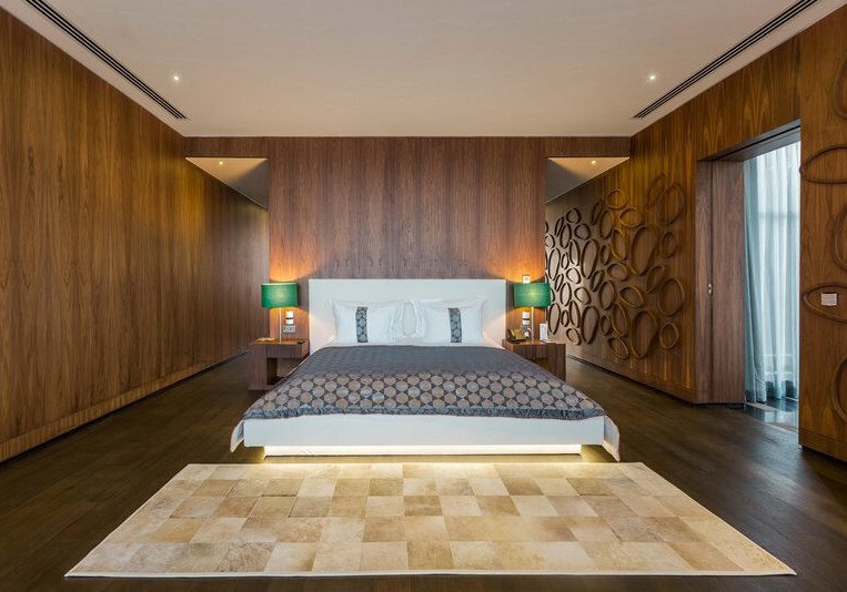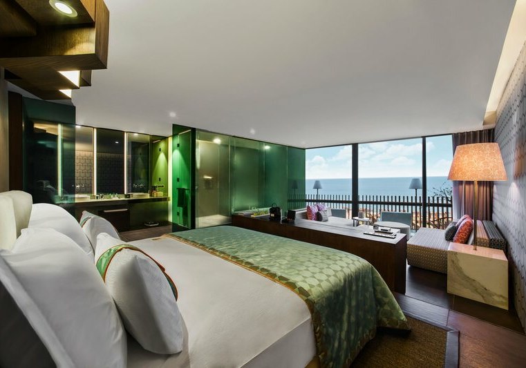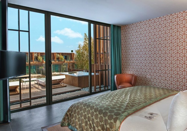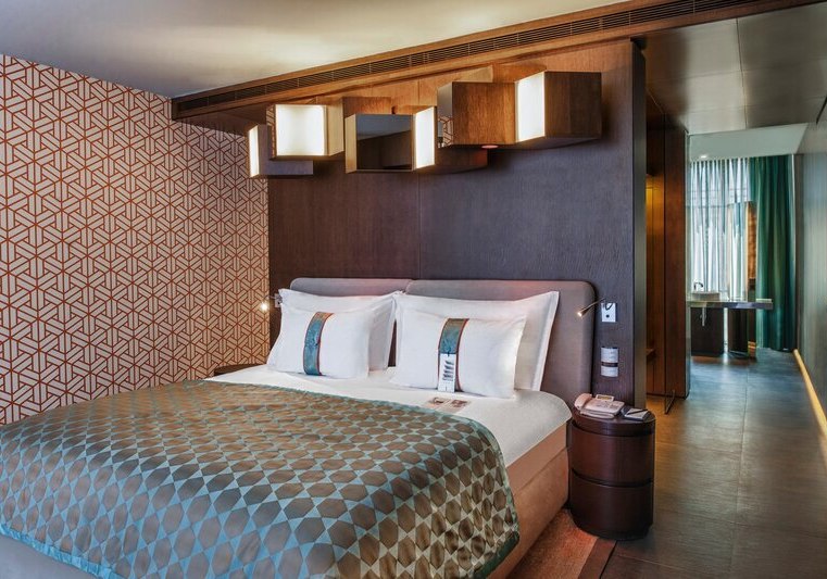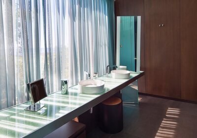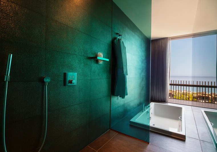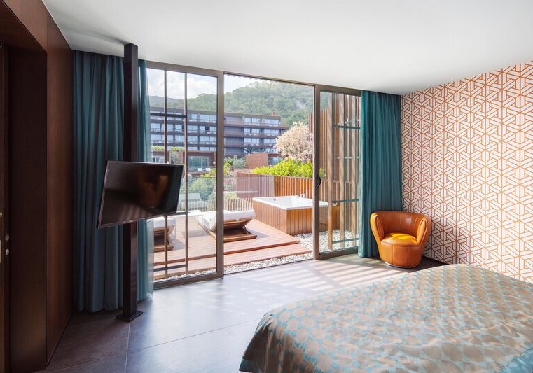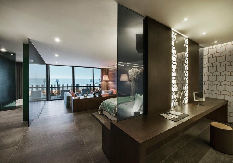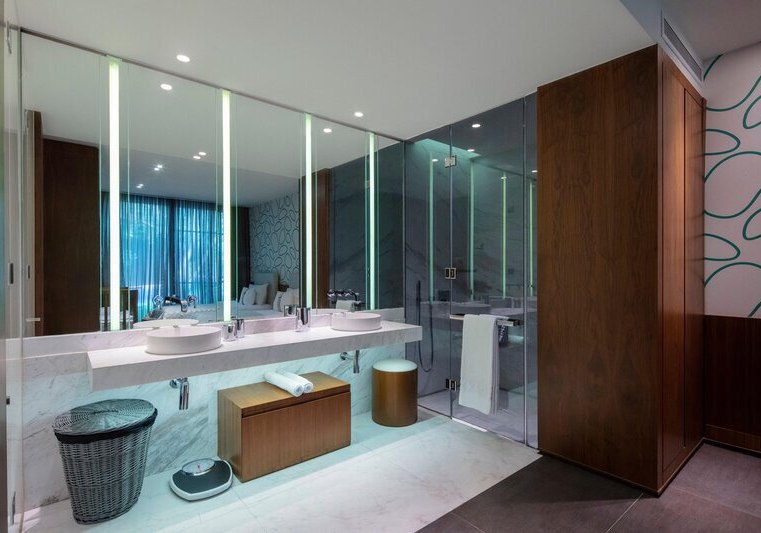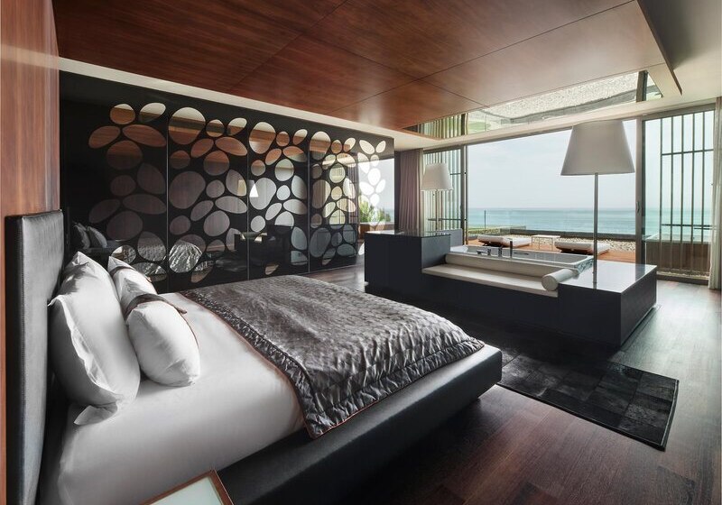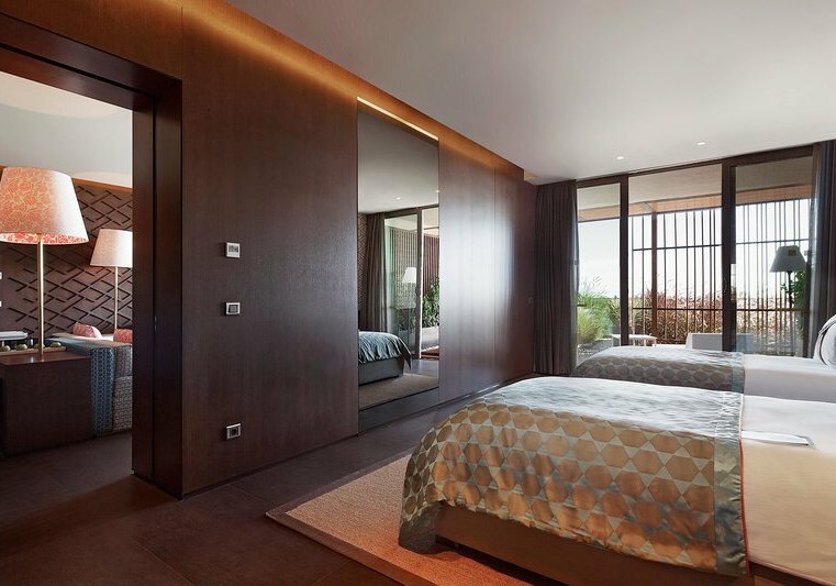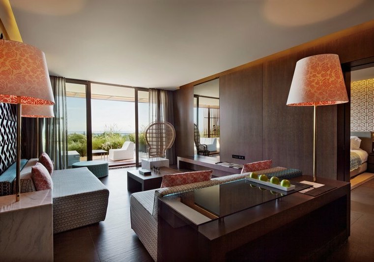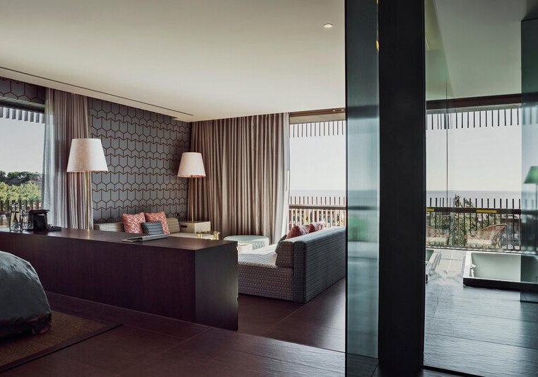 Die Suiten starten bei etwa 100 Quadratmetern und kombinieren Wohn- und Schlafbereich mit Ankleide. Keramikboden, individuelle Klimaanlage und ein Balkon mit Sonnenliegen setzen klare Akzente. Bad mit Doppelwaschbecken, Dusche und Whirlpool, dazu Bademantel, Slipper und durchdachte Details wie Media-Hub und Nespresso.