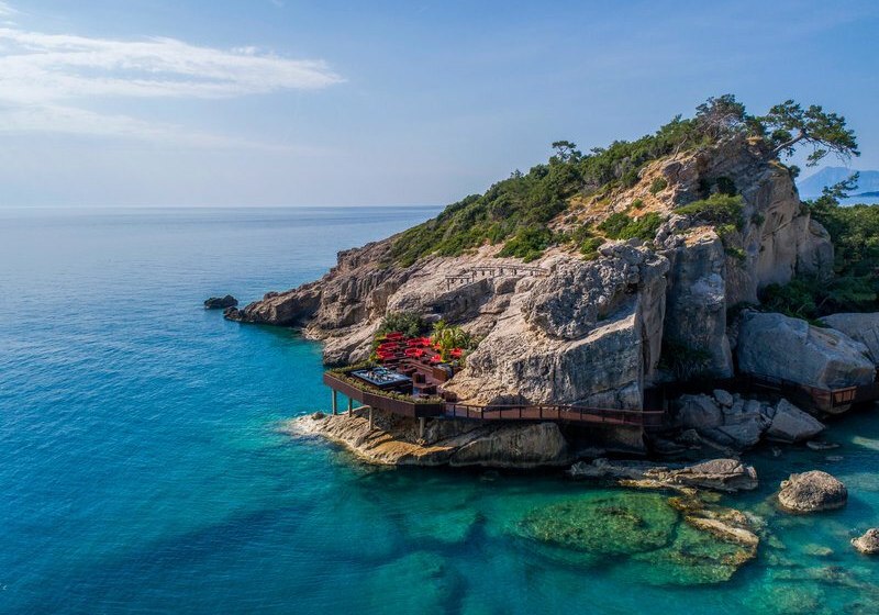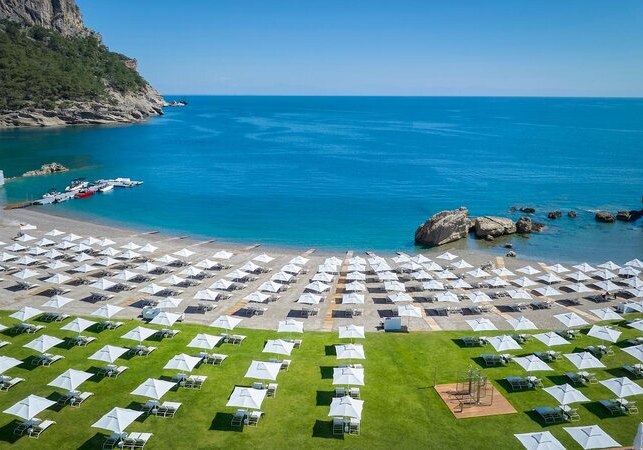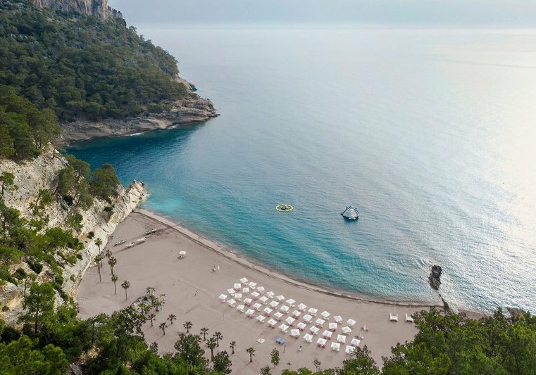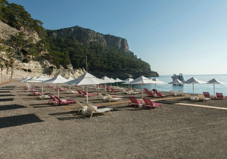 Ihr wohnt in Kiris direkt am rund 800 Meter langen Strand, strukturiert in Abschnitte wie Long Beach mit Kies, einen Kinder-Sandstrand und den Tangerine Beach sowie eine Privatbucht. Bis nach Kemer sind es etwa sechs Kilometer, Einkaufsmöglichkeiten liegen nahe, öffentliche Verkehrsmittel sind verfügbar.