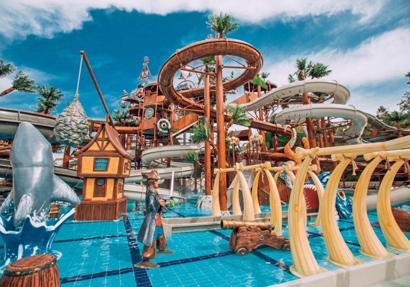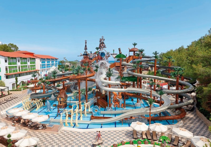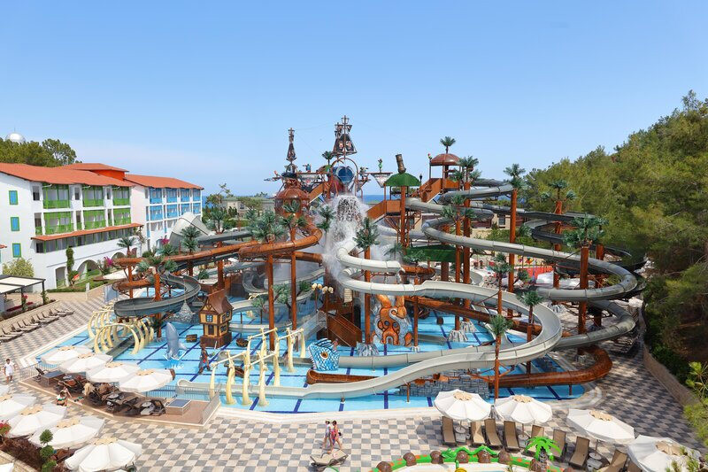 Der Aquapark mit 15 Wasserrutschen und der Pirates of Olympus Bereich mit Splashzone und Babypool sind zentrale Treffpunkte. Am Strand nutzt Ihr Badesteg, Liegen, Sonnenschirme und Badetücher. Haustiere sind auf Anfrage möglich; dafür existiert ein Sonderbereich mit Tierarztzeiten.