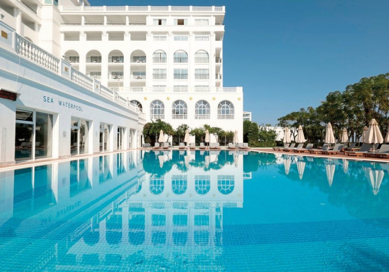 Die Wege führen vorbei an Süßwasser-Hauptpool, Meerwasserpool, Relax-Pools und dem Aquapark mit 15 Wasserrutschen. Familien nutzen Pirates of Olympus mit Splashzone und Babypool, Ruhesuchende verteilen sich auf Terrassen und Liegewiesen. Bars, Cafés und Snackstationen liegen praktisch auf der Strecke, sodass Ihr tagsüber flexibel bleibt.