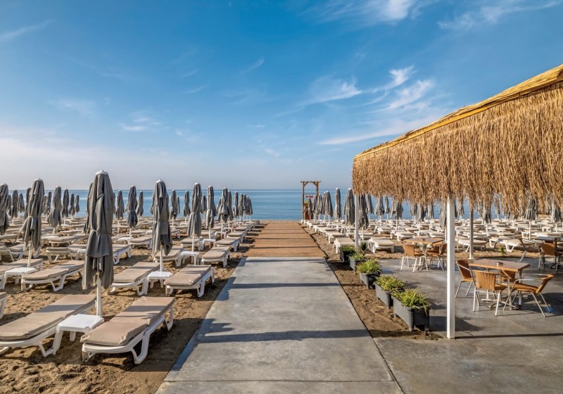 - Eigener Strand: Strandabschnitt mit Bar, Liegen und Schirmen direkt vor Ort.