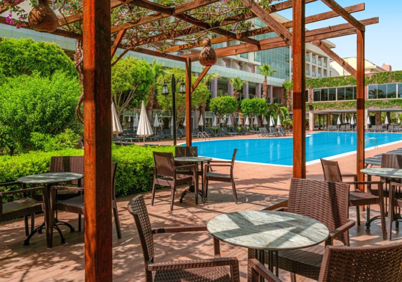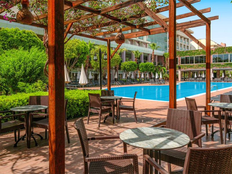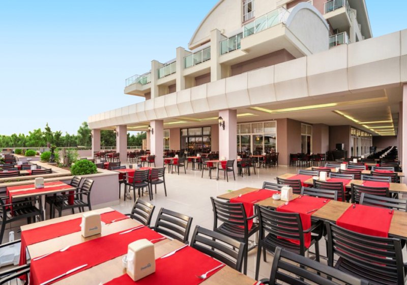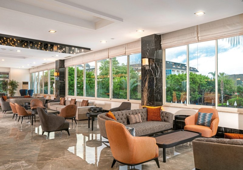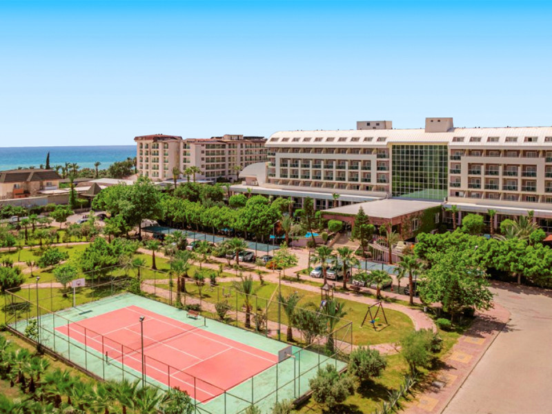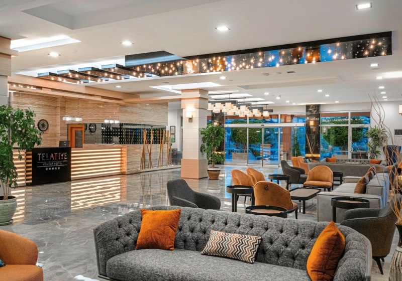 Im Telatiye Resort erwartet Euch ein lebhaftes Strandresort mit direktem Draht zum Mittelmeeralltag. Die Anlage gruppiert sich um Pools, Terrassen und einen eigenen Strandabschnitt aus Sand und Kies. Ihr bewegt Euch zwischen Lobby mit Sitzgruppen, Patisserie und Bars, während draußen Wasserrutschen, Sonnenterrasse und der Blick Richtung Küste die Kulisse setzen. Familien finden Platz und Struktur, Aktivreisende kurze Wege zu Sport und Programmen.