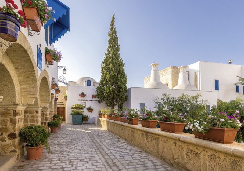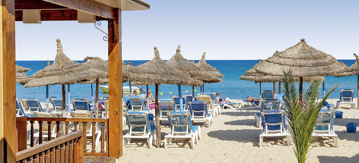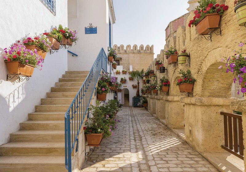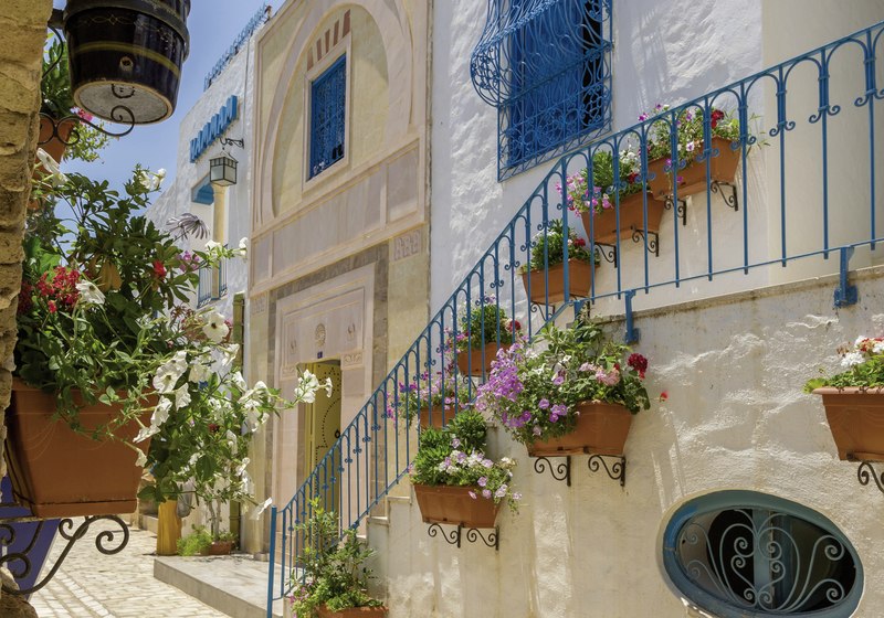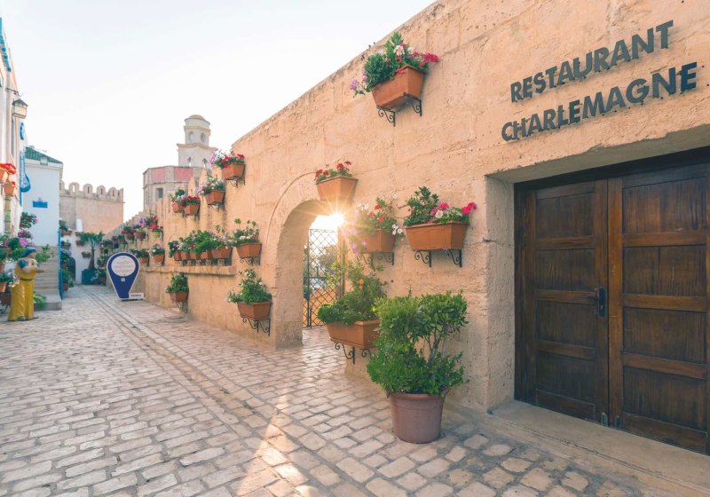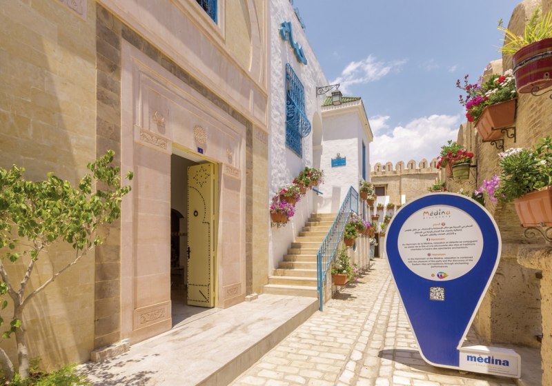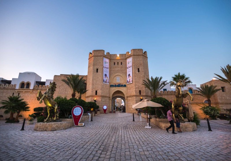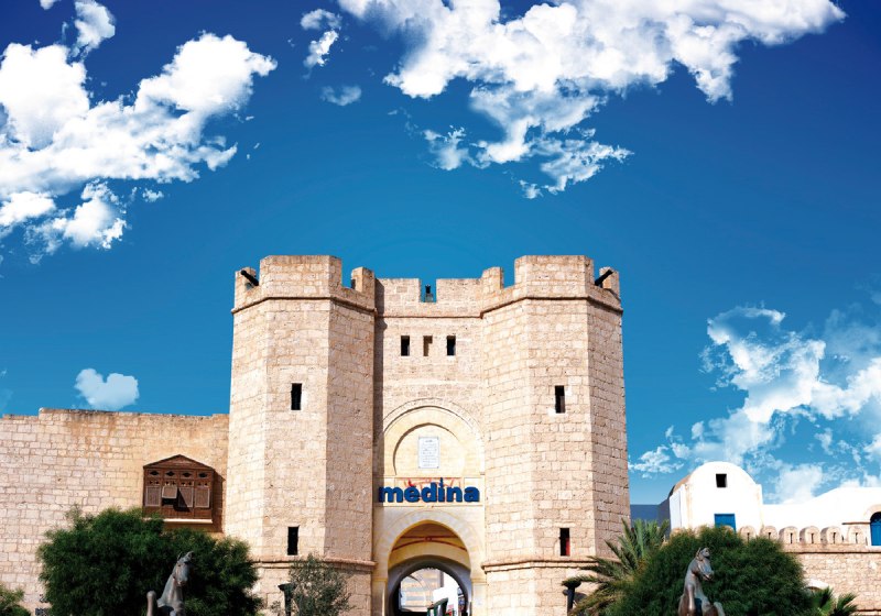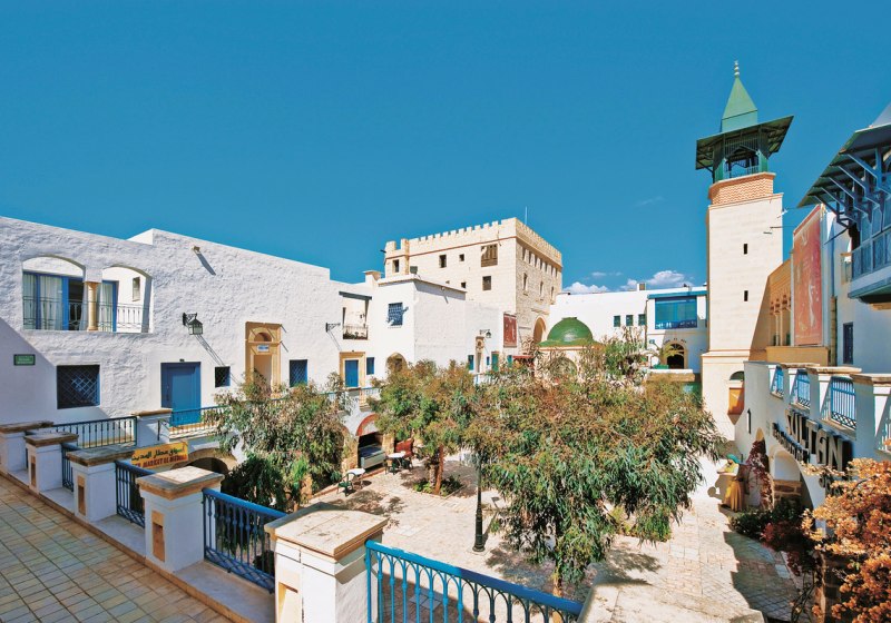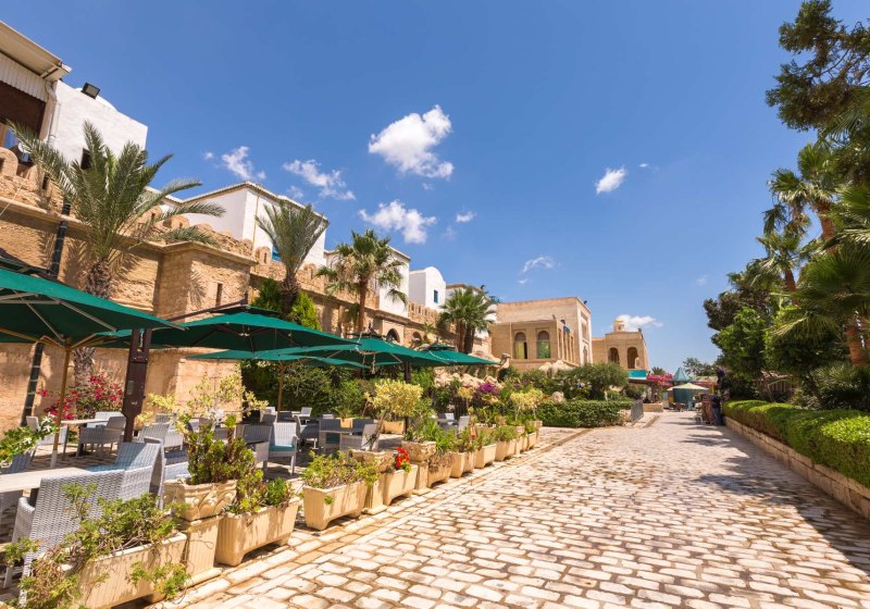 Ihr residiert in Hammamet-Yasmine, direkt innerhalb der Medina Mediterranea. Von hier aus betretet Ihr Basar, Museen, eine Disco-Bar und den Themenpark Carthageland ohne Umwege. Die Strandpromenade und der Strand von Yasmine liegen etwa 300 Meter entfernt – nah genug für spontane Badepausen und Abendspaziergänge.