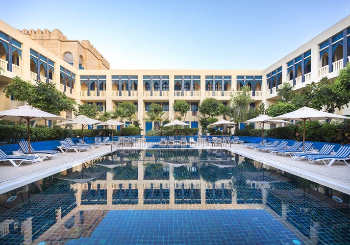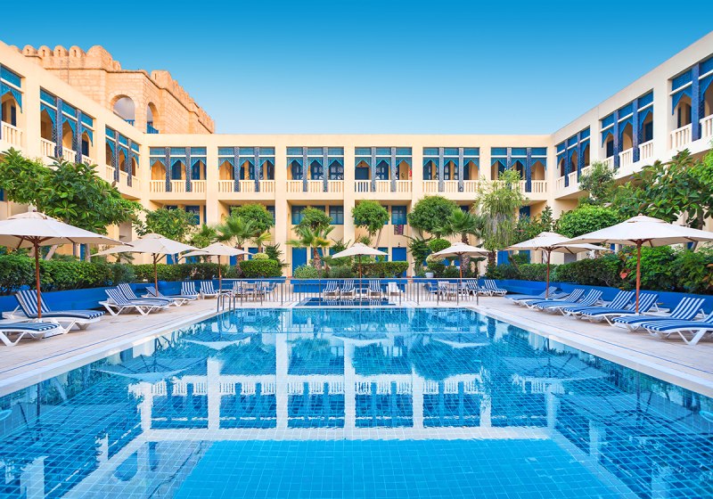 Drei Gebäudetrakte, eine Lobby mit Lift und weitläufige Außenbereiche geben dem Diar Lemdina Hotel eine klare, leicht navigierbare Struktur. Zwei Außenpools mit Sonnenliegen, Schirmen und Badetüchern sowie ein beheiztes Hallenbad verteilen Badestationen über die Anlage – ergänzt durch eine Sonnenterrasse für ruhige Momente.