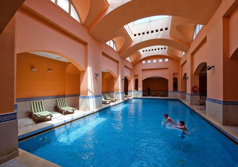 Für entspannte Bahnen steht Euch das beheizte Hallenbad zur Verfügung. Der kurze Weg zum öffentlichen Hamam in der Medina ergänzt das Angebot um authentische Bade- und Dampferlebnisse außerhalb der Hotelmauern – ideal, wenn Ihr die lokale Badekultur einbeziehen möchtet.