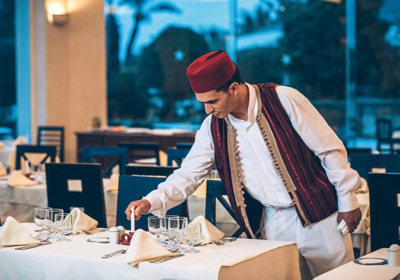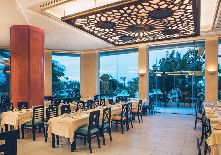 Ihr wählt zwischen Hauptrestaurant und Themenrestaurant, ergänzt durch Bars, Snackbar und ein maurisches Café. Kulinarisch deckt die Küche ganztägige Verpflegungsarten ab – vom Frühstück bis All Inclusive, inklusive Snacks. Alkoholische und alkoholfreie Getränke sind verfügbar, vegetarische Kost sowie Kindermenüs runden das Angebot ab.
