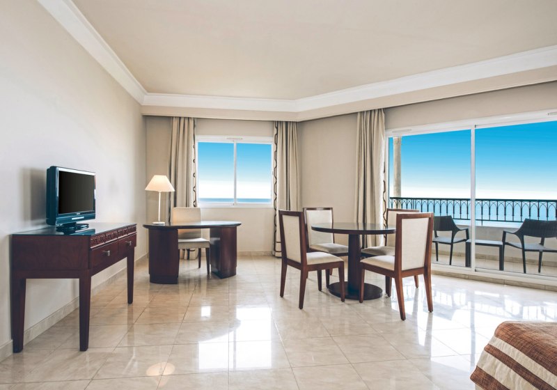 Ihr wählt zwischen Doppelzimmern, Superior-Zimmern, Juniorsuiten mit Sitzecke, Suiten mit separatem Wohnraum und Meerblick sowie Familienzimmern mit circa 42 Quadratmetern. Twin-Betten, Vergrößerungsspiegel und Außenmöbel unterstützen den Komfort, einige Kategorien bieten zusätzliche Sitzbereiche. So findet Ihr vom Paar-Setup bis zur Familienlösung passende Zuschnitte. Highlight: Suite mit separatem Wohnraum und garantiertem Meerblick.