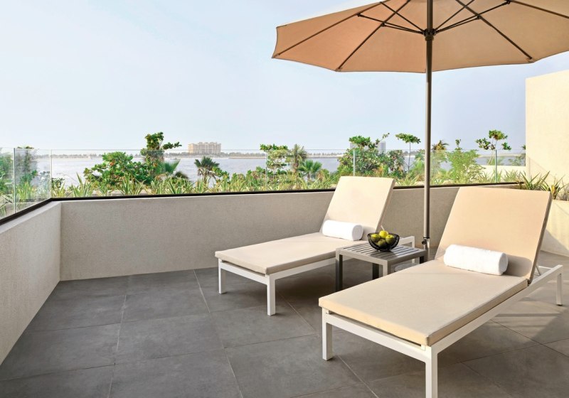 Auf Marjan Island in Ras Al Khaimah wohnt Ihr direkt an einem 300 m langen Sandstrand. Die Wege ins Wasser sind kurz, die Strandbar liegt nah, und der schwimmende Wasserpark verleiht dem Küstenabschnitt eine dynamische Note. Bis zum Flughafen Dubai (DXB) sind es etwa 98 km.