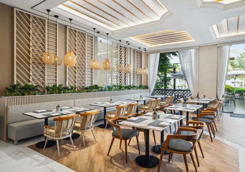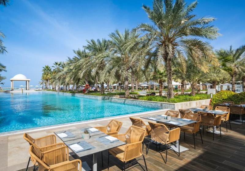 Mehrere Restaurants, Bars und Lounges bilden den kulinarischen Rahmen – vom All-Day-Dining „The Kitchen“ mit breiter Auswahl bis zum „Al Maeda“ mit regional geprägten Spezialitäten. Ein Restaurant mit Live-Show-Cooking bringt Nähe zur Zubereitung an den Tisch. An Pool und Strand sorgen Bars für kurze Wege und erfrischende Pausen. Highlight: Vielfältige Kulinarik mit Show-Cooking und Strandbars.