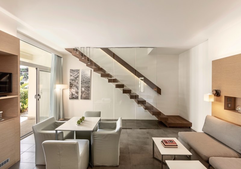 Mehr Raum bieten die Deluxe-Doppelzimmer mit größerem Balkon, Espressomaschine und Meerblick. Markant ist die Suite Duplex Meerblick: zwei Ebenen mit Kingsize-Bett und Sitzecke, zwei Bäder, auf jeder Etage ein Smart-TV, dazu Minibar, Tee-/Kaffeezubereiter und Espressomaschine. Draußen erwarten Euch ein Balkon mit Meerblick und eine Terrasse mit beheiztem Whirlpool auf rund 46 Quadratmetern – ein klar definiertes Upgrade.
