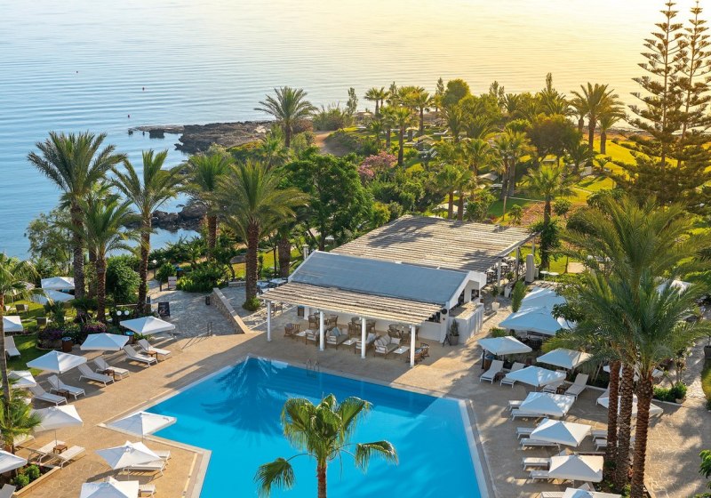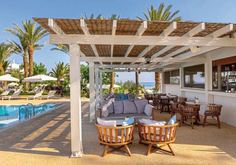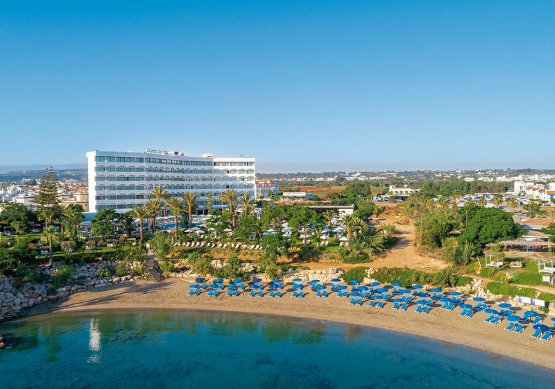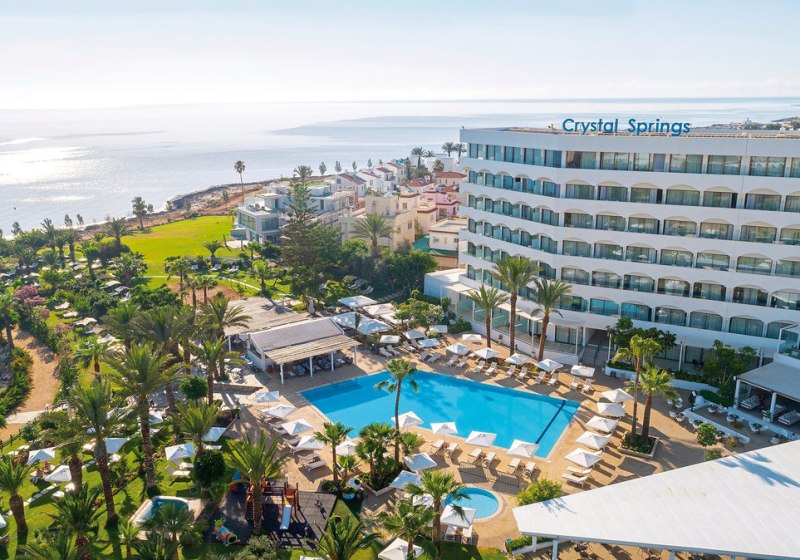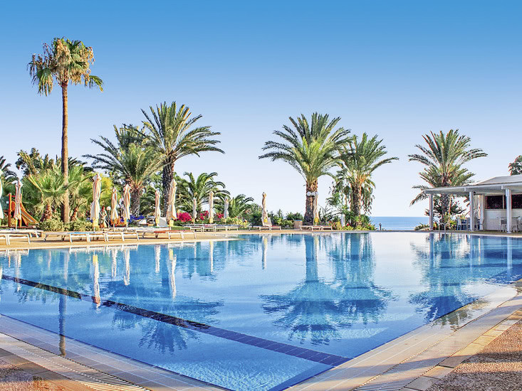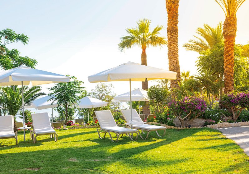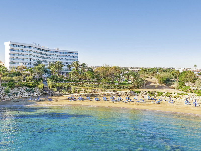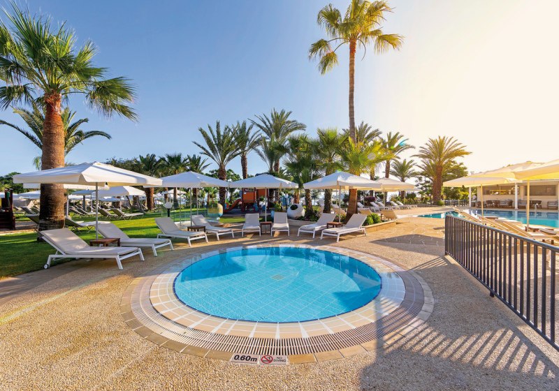 Im Crystal Springs Beach Hotel wohnt Ihr direkt über einer kleinen Sandbucht von Protaras. Terrassenförmig fällt der Garten zum Meer ab, dazwischen liegen Pool, Sonnenterrassen und schattige Plätze. Die Anlage wirkt übersichtlich und entspannt, mit klaren Wegen zwischen Lobby, Restaurants und Strandzugang. Highlight: Terrassengarten bis zur Bucht, kurze Wege in alle Bereiche.