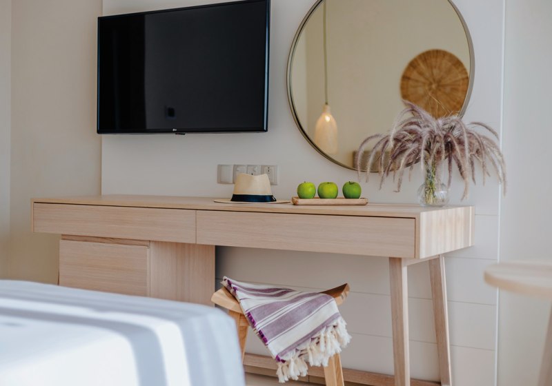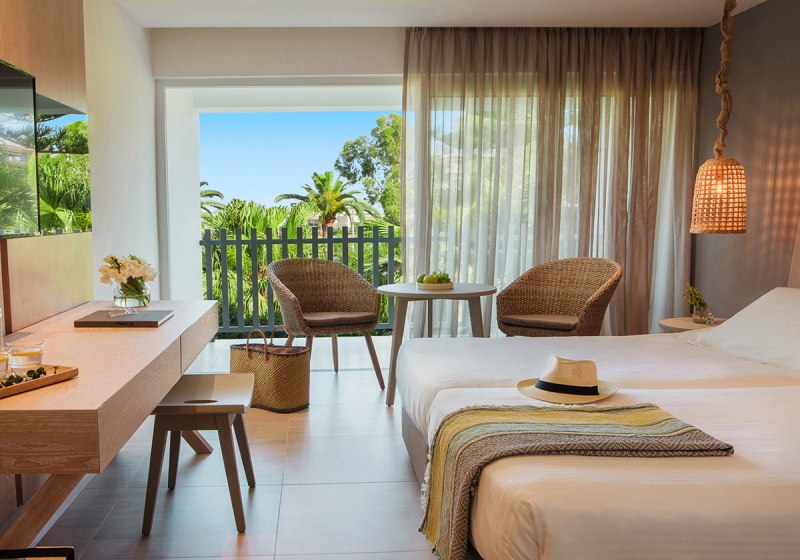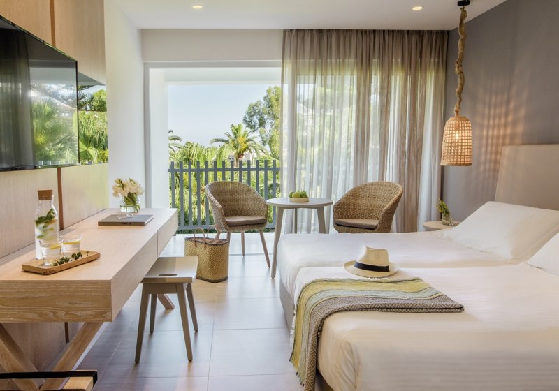 Eure Zimmer verfügen über Klimaanlage, Balkon, Dusche/WC, Föhn, Minikühlschrank, Sat-TV, Telefon, Safe und WLAN. Eine Kaffee-/Tee-Station ist integriert. In vielen Kategorien blickt Ihr in Gartenbereiche, die Wege bleiben kurz und übersichtlich. Highlight: Balkon in jeder Kategorie für Luft und Licht.
