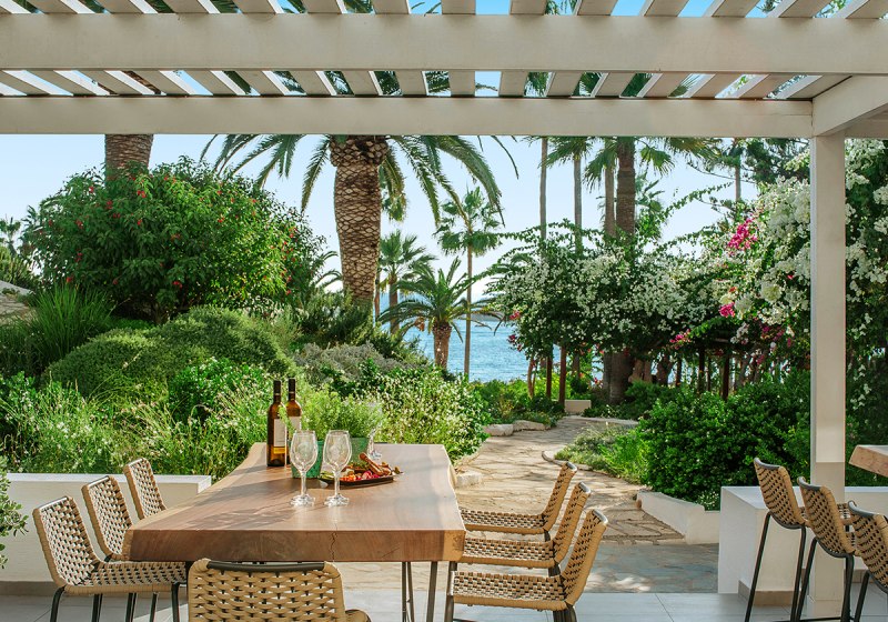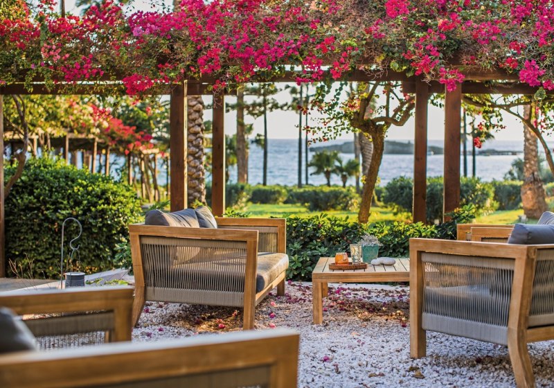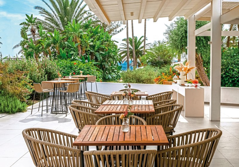 • Ambrosia: Terrasse mit Gartenblick, klar strukturiertes Restaurantkonzept.