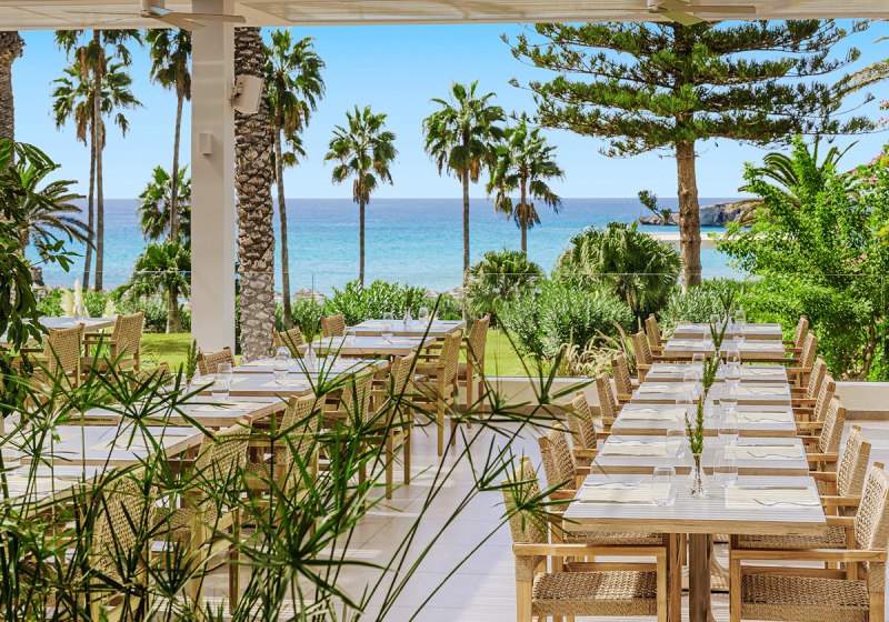 Im Restaurant Ambrosia esst Ihr auf der Terrasse und blickt in den Garten, dazu stehen Bars und eine Pool-Snackbar bereit. Verpflegung ist flexibel: von Frühstück bis All-Inclusive, mit Optionen wie Halbpension, Vollpension, Snacks, Kindermenüs, vegetarischen und glutenfreien Gerichten. Highlight: Ambrosia-Terrasse als zentraler kulinarischer Treffpunkt.