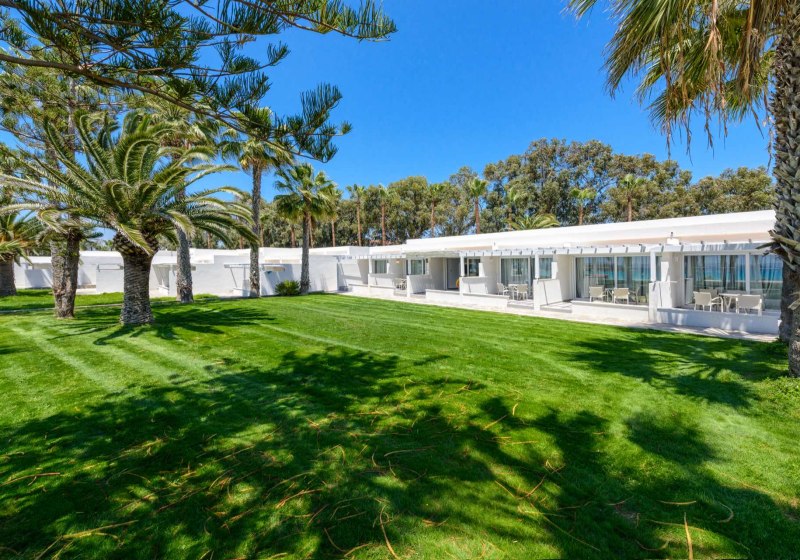 Im Nissi Beach Resort wohnt Ihr direkt an der Nissi-Bucht und spürt das Meer schon beim Ankommen. Die Anlage wirkt weitläufig, mit gepflegten Gärten, Süsswasserpool und ruhigen Wegen zum Strand. Familien, Paare und Strandliebhaber finden hier klare Strukturen, freundlichen Service und einen unaufgeregten Rhythmus zwischen Wasser, Grün und Terrasse.