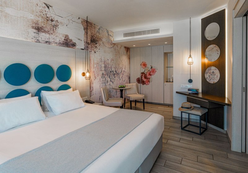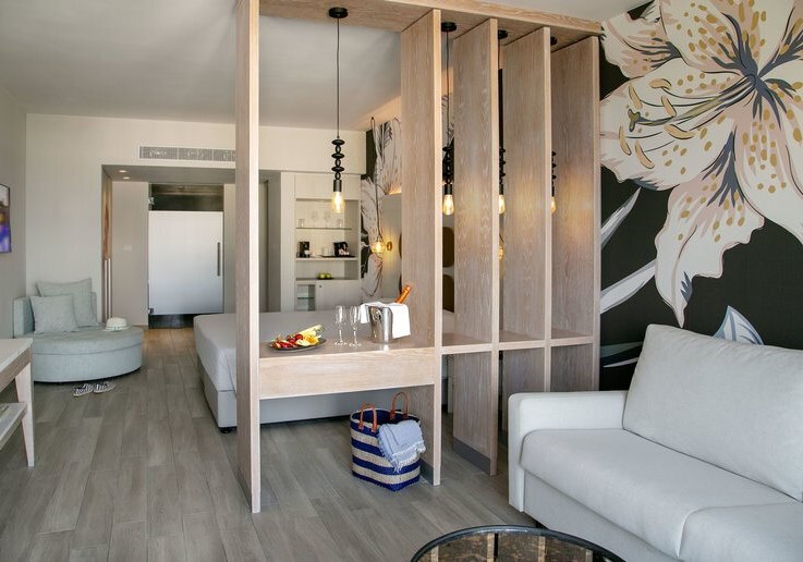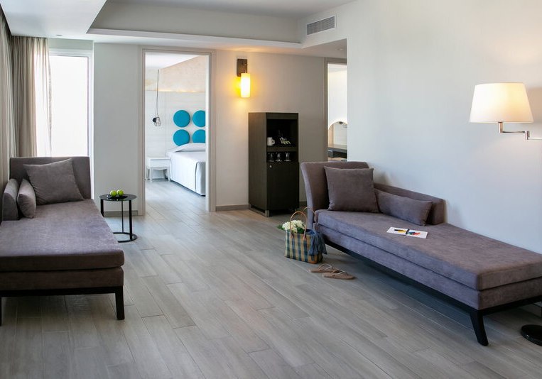Juniorsuiten bieten ein Kingsize-Bett, Badewanne plus Dusche sowie eine Espressomaschine. Suiten verfügen über ein separates Schlafzimmer, einige Kategorien führen mit Schlafsofa flexibel durch den Tag. Küchenzeilen in ausgewählten Einheiten eröffnen einfache Selbstversorgung. Die Ausblicke reichen je nach Lage bis zum Meer oder ins Umfeld.