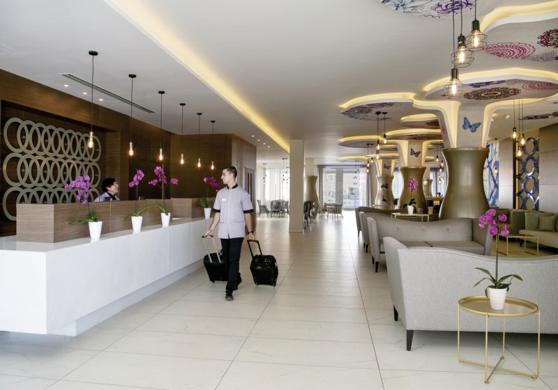 Die Anlage ist großzügig gedacht und klar gegliedert: Rezeption, Lounge und Foyer bilden das ruhige Zentrum. Außen- und Hallenbad, Hauptpool und Adults-only Pool verteilen Ströme geschickt, Kinderbecken und Spielplätze liegen gut sichtbar. WLAN steht in der gesamten Anlage kostenfrei bereit; Liegen und Schirme sind am Pool inkludiert.